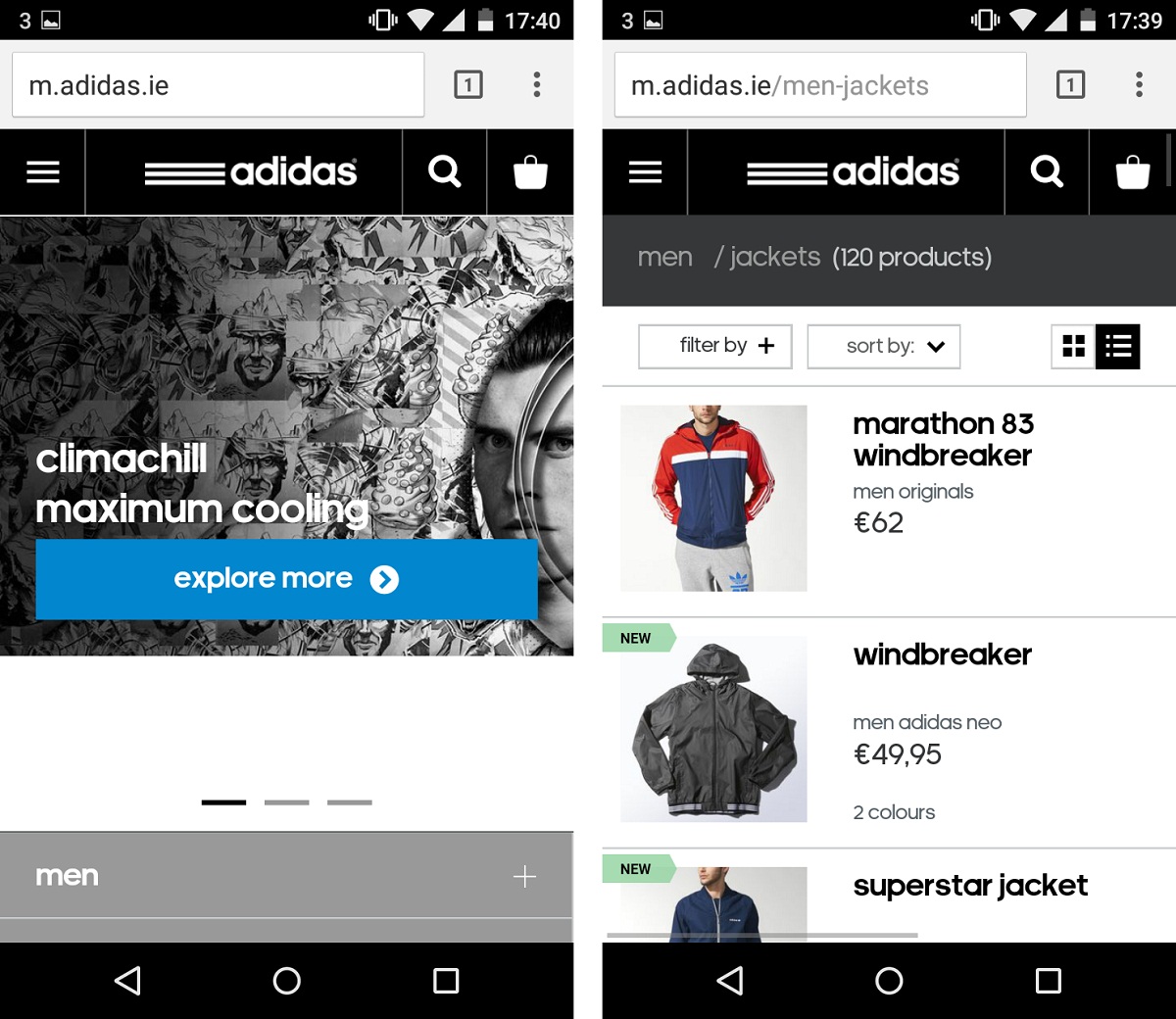 Adidas provides its mobile visitors with a website that mimics the desktop website making a seamless experience. It comes with lighter images and simplified shopping process.