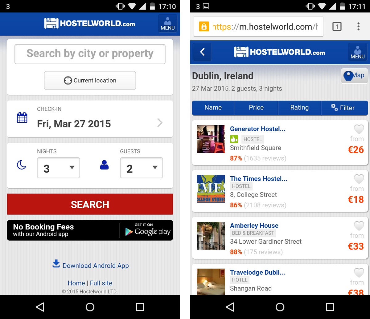 Hostelworld.com is a yet another travel-focused adaptive website example on this list addressing mobile visitors with an optimized, adaptive experience. Hostelworld’s website features a mobile-optimized search engine including a GPS-powered ‘Current location’ feature.