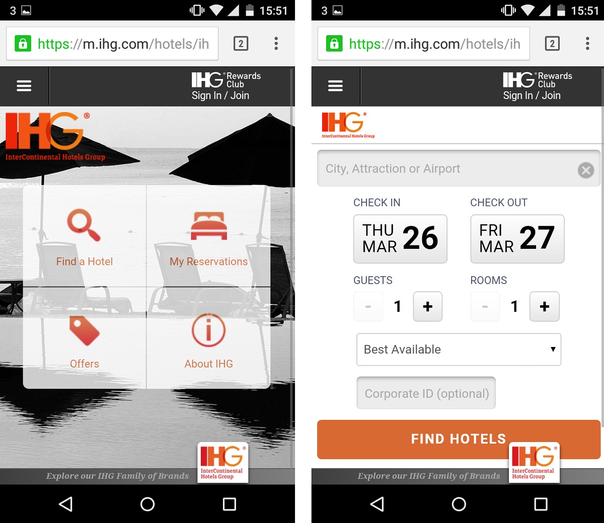 InterContinental Hotels Group has decided that mobile users are focused on quickly finding and reserving a hotel. Thus the mobile website encourages on-the-go local bookings through location services, serving up nearby hotels to customers based on GPS data from their phones. The mobile site is action-oriented, with quick-links to find a hotel nearby, review your reservations, and view current offers.