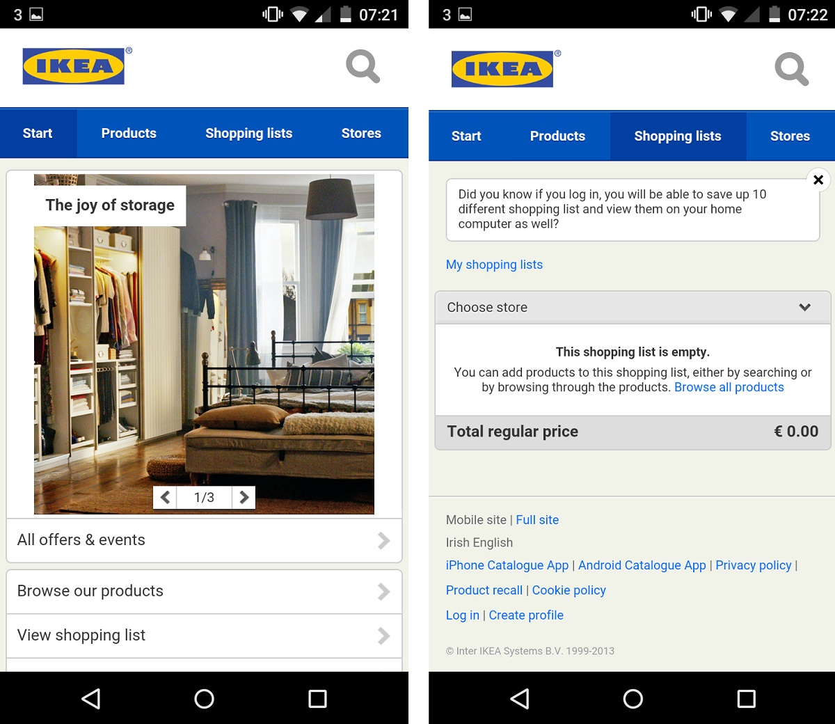 Another neat example is IKEA's mobile website. It utilizes a smartphone-tailored version with streamlined menus and product browsing, also highlighting the shopping list option which on the desktop site is much less conspicuous. This is obviously targeted at customers who have their phones with them while shopping in a physical location.