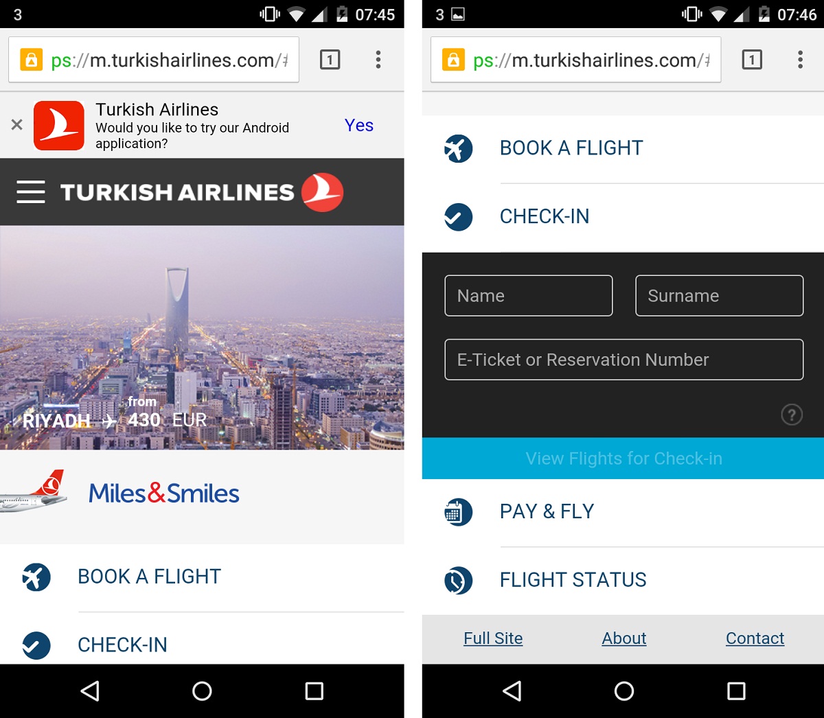 Turkish Airlines offers its mobile visitors the choice of three different experiences. Users choose between desktop website, mobile website, and mobile app. Below you can see the mobile website which comes with a redesigned, streamlined look to fit smallers screens. Its designers highlighted features sought by travelers (online check-in, travel details), as well as all mobile users looking to book a flight.