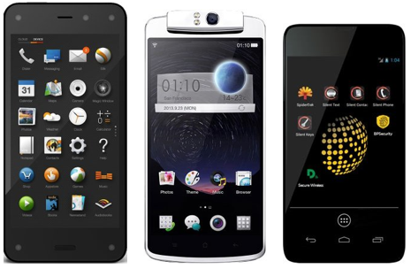 A taste of Android forks: Amazon Fire Phone/Fire OS (left), Oppo N1/CyanogenMod (middle), Blackphone/PrivatOS (right)