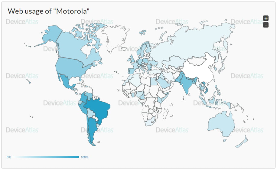 Motorola smartphones are most popular in Latin America, where it enjoys 14.8% share in Brazil, 11.17% in Argentina, 7.36% in Colombia and 6.19% in Mexico. It's also the 7th most popular device manufacturer in India with 3.43% of overall traffic in our Q2 data.