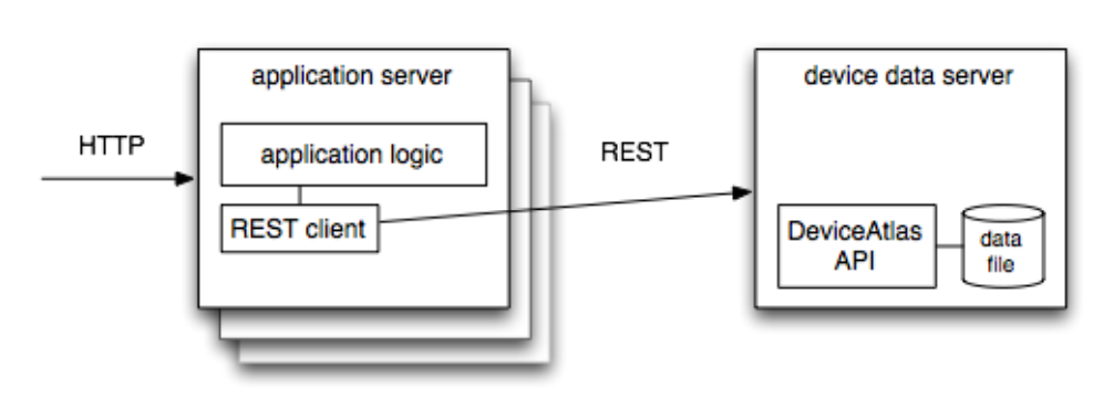 This option makes the most sense when multiple different applications are using DeviceAtlas in different ways, and where a centralized architecture can be made fast enough to work well. In this type of deployment, DeviceAtlas is typically configured to be available for queries via REST API, thus making it language-neutral and relatively efficient to query across the network.