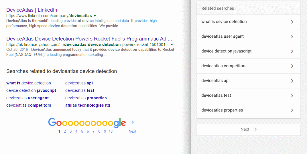 One example of this is how Google expands the size of tap targets for touch devices, to create the so-called 'fat-finger' tap targets. This is visible in "related searches" at the bottom of the search results page where Google makes it easier to tap the links for mobile users. Also, note how the iconic desktop "Goooooooooogle" and the tiny page numbers were replaced with a simple "Next" button on touch devices.