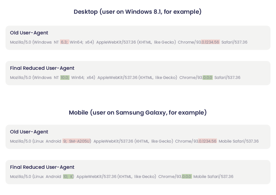 More recently, Google introduced a new variation on the initiative, by introducing what it terms User-Agent Client Hints. These contain information traditionally included in the user-agent string, and, invoking privacy as the rationale, Google reduced the information available in the Chrome and Chromium user-agent string, placing the information instead in Client Hints. Since Chrome 110, user-agent strings appear as below (green highlights reflect frozen elements)