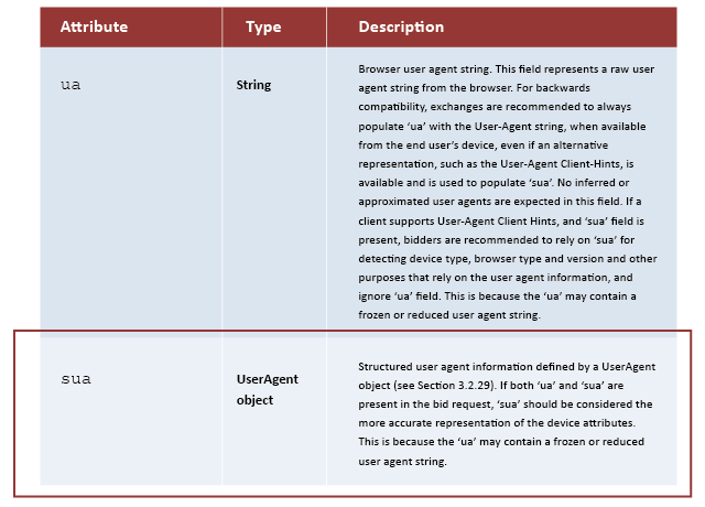 An important addition to the IAB OpenRTB 2.6 specification is the SUA Object in the Device Object. This carries a representation of the hints available from the client, albeit in a different format to hints retrieved from the headers or via JavaScript. (This necessitates handling a third method of parsing hints)