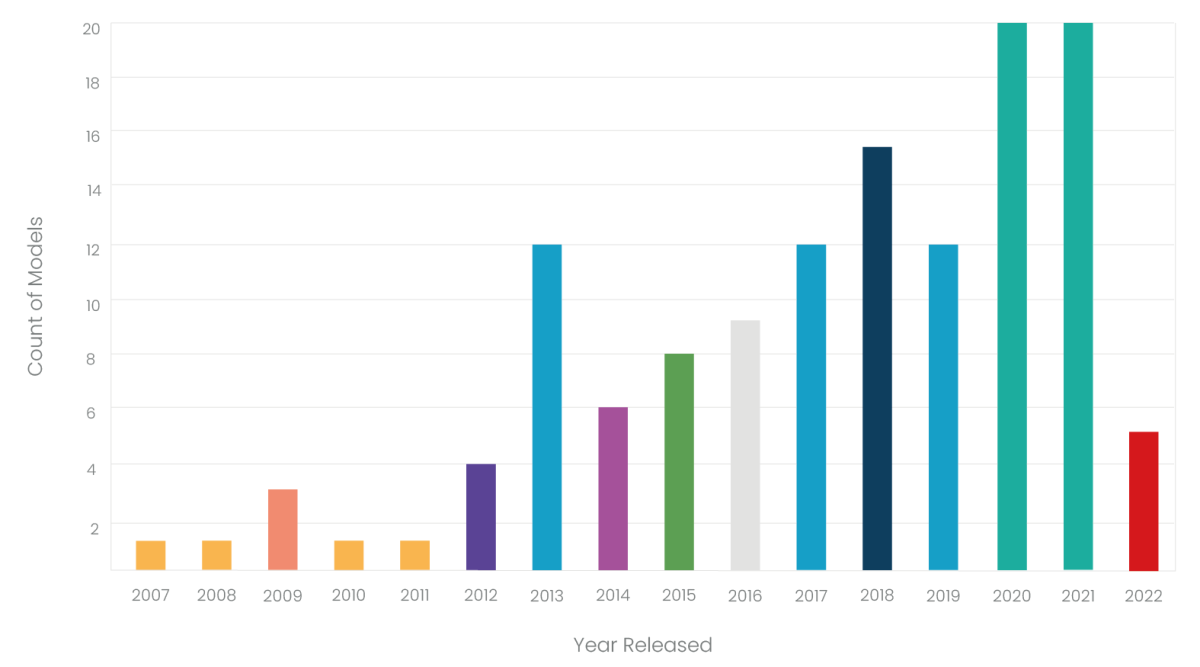 Also interesting is the data around the number of models released by year – over time, different devices were developed for specific geographic markets, as well as newer or smaller versions of particular models. For example, in 2021, 20 variations of the iPhone 13 were released between the standard, mini, pro and pro max versions, and also for various international markets. So while many of these models were identical physically, their characteristics were not.