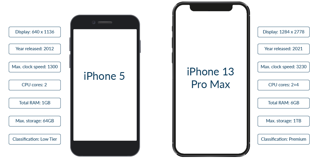 DeviceAtlas enables web servers to identify precisely which iPhone model they are dealing with (achieved through the pioneering approach of using a JavaScript library to provide supplementary information). This generates fine-grained analytics for clients as well as the ability to tailor content for best results based on the capabilities of a specific model. Just recently we analysed some of our iPhone traffic to understand how many unique models are still currently active. Surprisingly, we noticed some instances of iPhone 5 users - the graphic below shows the differences in device capabilities between the iPhone 5 and iPhone 13 Pro Max (currently the highest spec iPhone released).