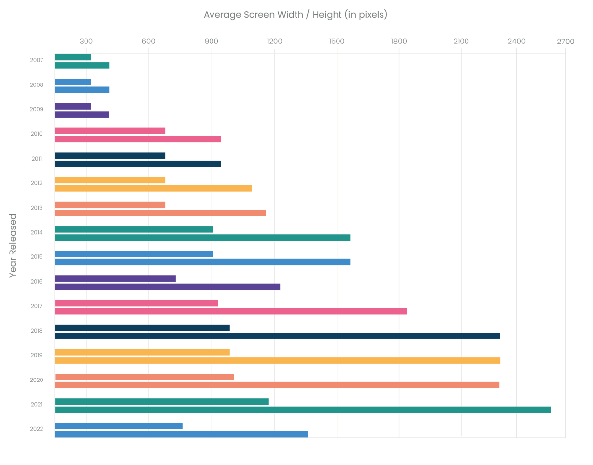 We have also broken down the average screen width and height by year released. Unsurprisingly, the iPhone screen has become bigger over time. This was hugely influenced by changing consumption trends and smartphones becoming streaming and gaming devices as well as a platform for communicating, browsing the Internet, and listening to music.