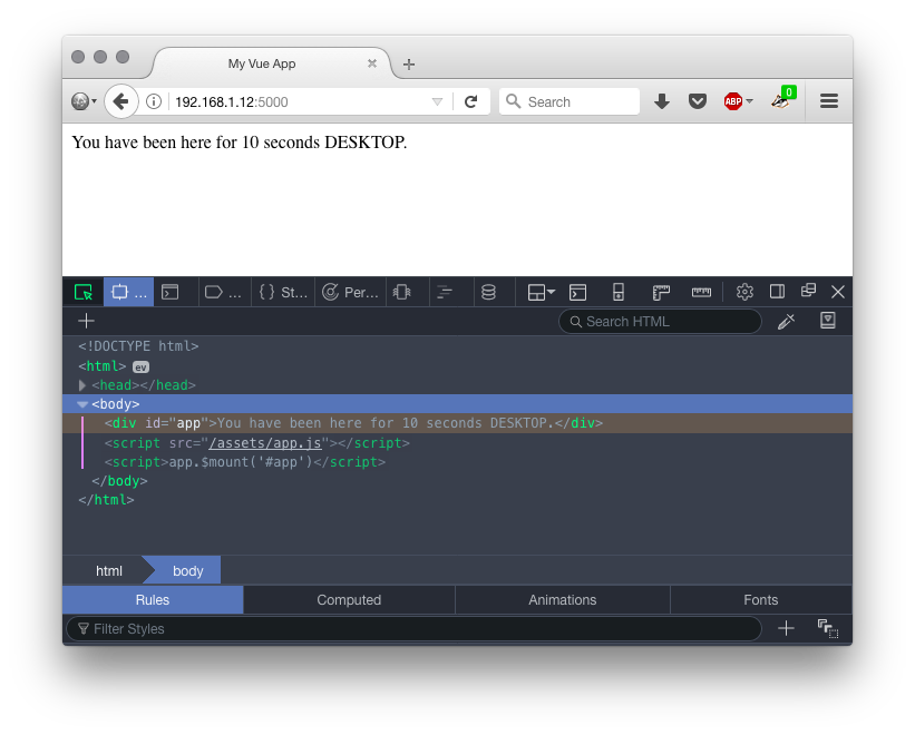If you check the page source (View source), and compare with the DOM inspector in your dev tools, you should see something interesting. In the original source, you can see that the div with id="app" has an attribute server-rendered="true". Congrats! Server-side rendering with Vue is up and running.