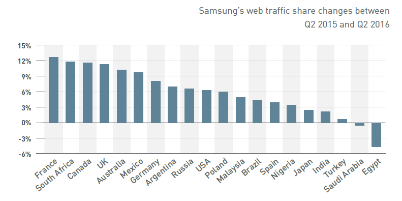 The main focus of the Q2 2016 report is on comparing the largest phone makers and analysing how their share changed between Q2 2015 and Q2 2016. We learned that either Apple or Samsung are the most used phone makers in all 20 countries analysed. Apple lost a lot of web traffic in all countries except for Saudi Arabia. The largest losses happened in Poland, Mexico and Canada.