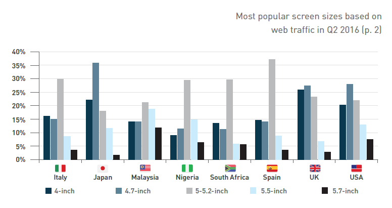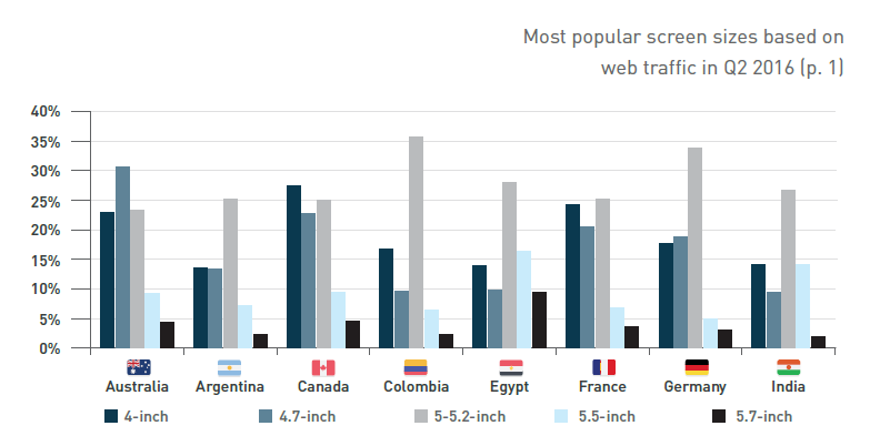 With most flagship phones offering 5 - 5.2-inch screen sizes, it may sound counter-intuitive that 4-inch phones get a share of around 20 - 25% in many large markets. This is likely due to the huge installed base of iPhone 5/5S and the release of iPhone SE at the end of March 2016. The 4-inch screen size is the most popular in Canada, the second most popular in the UK and France, and the third most popular in the USA and Germany.