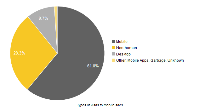 Mobile devices are not the only "visitors" we tracked. Some 28% of visits were from non-human sources. Robots, crawlers, checkers, feed fetchers, spam and so on. A large part of robot traffic is made up of Google crawlers. Their presence in logs massively changes the overall picture of site visitors.