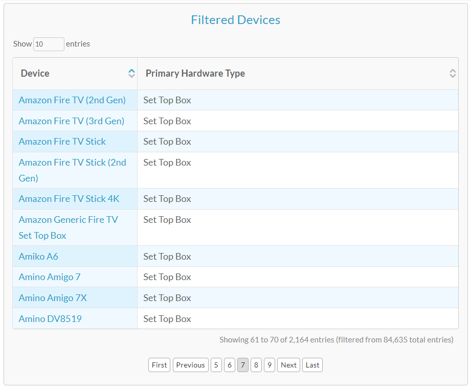 When we originally published this article in 2018, there were 562 Smart TVs and 685 STBs (set top box) in the DeviceAtlas database – now in 2022, those numbers have increased significantly to 3,549 and 2,164 respectively. Interestingly, the number of Smart TVs has exceeded that of STB devices compared with 4 years ago.