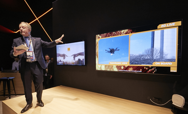 The drone was controlled by a 5G tablet at the Orange booth. It used a 5G router to relay very low latency, high quality video back to the conference.
